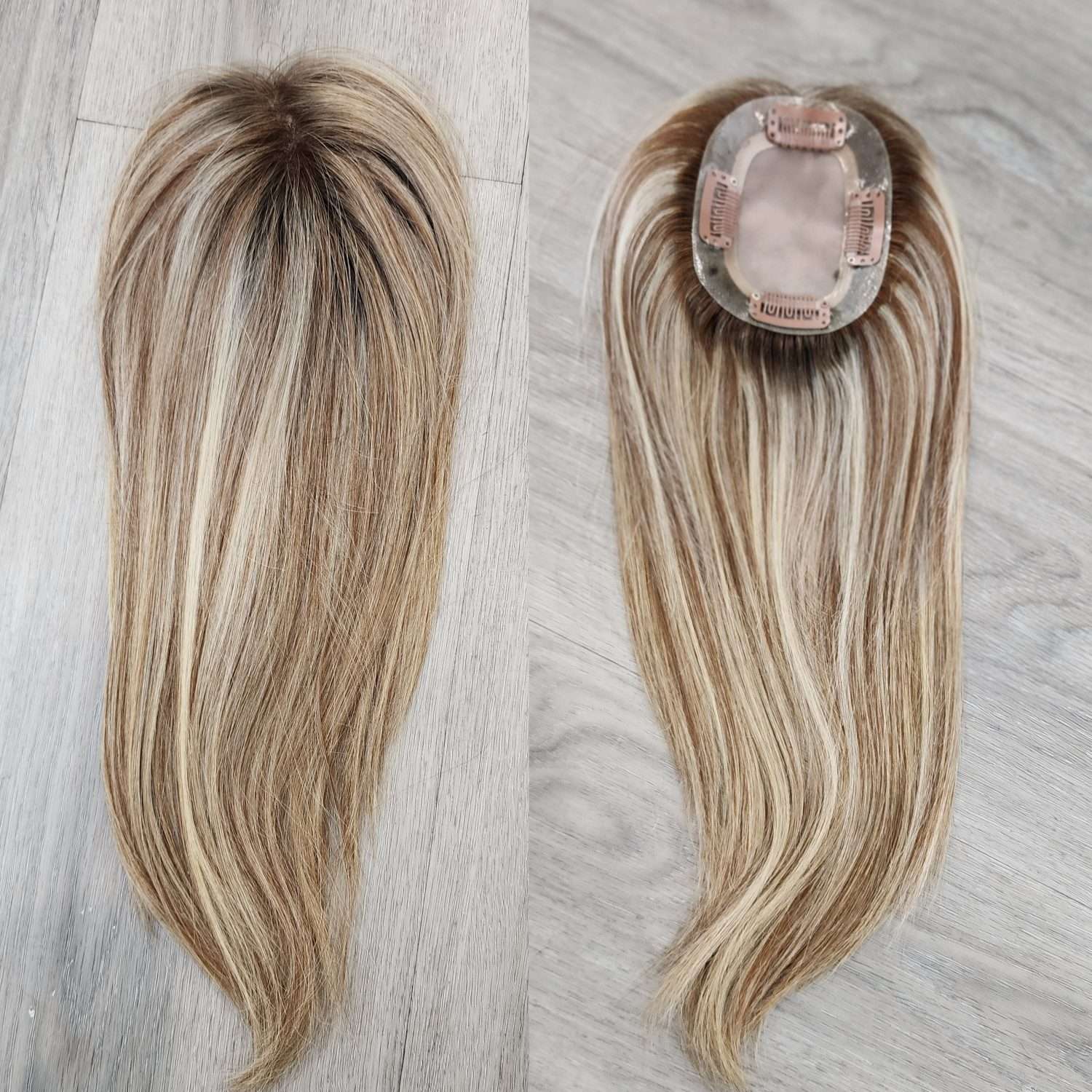 | Color : | Warm brown with blonde highlights, dark regrowth |